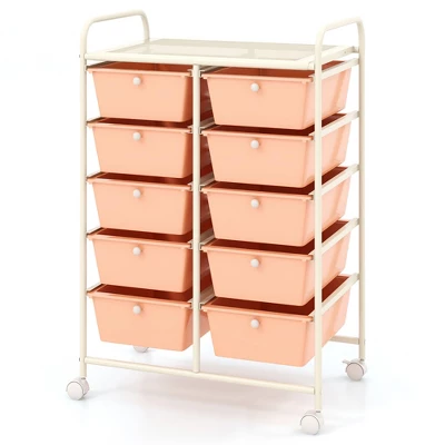 - Ample Storage Space: With 1 large top platform (23″ L x 14.5″ W) and 10 practical drawers (13″ L x 10″ W x 5″ D), this rolling storage cart provides you with roomy space to store different items.