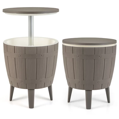 Enhance your outdoor parties with this 3-in-1 cooler bar table for on-demand chilled beverages.Crafted from all-weather PP material, this cooler is resistant to sunlight, rain and fading, making it a perfect year-round companion for your patio spaces. With 10-gallon capacity the ice bucket offers cooling for up to 6 hours, fitting 25 bottles or 50 cans to keep the good times rolling. The easy-to-lift tabletop makes the table perfect as an ice cooler, coffee table or cocktail table. Moreover, maintenance is a breeze with straightforward drainage system and wipe-clean surfaces. All in all, this well-made cooler bar table will elevate every gathering with convenience and style.
