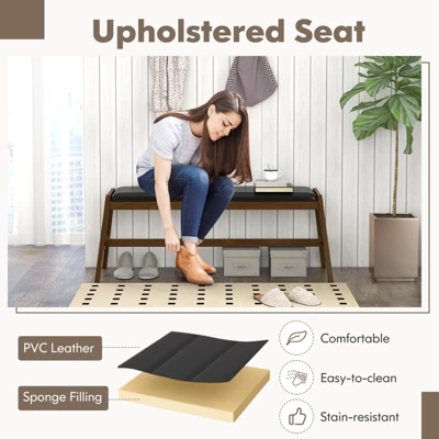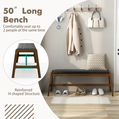 The dining bench boasts 50″ length, which can accommodate 2 individuals comfortably. The versatile wooden bench can serve as a comfortable seat in your home, hallway or office. Gifted from nature, the end of bed bench with solid rubber wood frame combines durability and stability, ensuring years of reliable service. Moreover, the reinforced H-shaped frame further increases sturdiness. The comfortable table bench boasts a foam padded seat cushion enveloped in skin-friendly PVC leather, offering a sumptuous seating experience, ideal for extended gatherings.