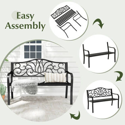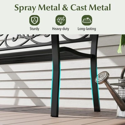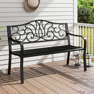 Tangkula 2-person Metal Bench W/ Floral Pattern Slanted Backrest Slatted Surface Black