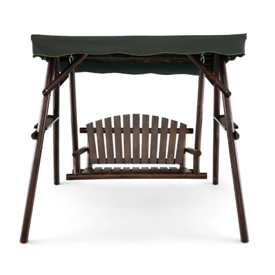 Elevate your outdoor leisure time with this exquisite swing chair! Featuring an elegant scalloped backrest, wide armrests, and a spacious seat, this 2-seater outdoor swing chair is designed for complete relaxation and enjoyment of leisurely moments with loved ones or friends. Crafted from high-quality fir wood with a carbonized finish, this swing chair offers excellent weather resistance and a charming rustic appearance. It is built to withstand long-term outdoor use and will add a natural touch to your backyard, garden, lawn, and more. Equipped with an oxford cloth canopy with an adjustable tilt angle, this swing chair provides shade and light rain protection for your comfort.