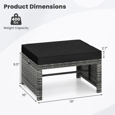 Enhance your outdoor living space with our versatile patio PE rattan ottomans.These outdoor ottomans are designed to serve not only as stylish footrests but also as comfortable extra seats or handy side tables. Crafted with sturdy metal frames and hand-woven, sun-resistant PE wicker, these outside footrests promise durability and stability. Additionally, each footstool comes equipped with a soft, high-density sponge cushion, securely fixed by buckles and features a removable cover for easy maintenance. With a robust build that supports up to 400 lbs and a height of 9.5 inches (without cushions), these wicker ottomans seamlessly integrate with your existing patio furniture (not included), making them ideal for your garden, porch or poolside setting.