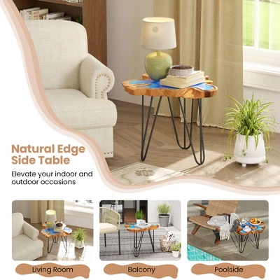 Elevate your indoor and outdoor occasions with this irregular side table.Crafted from high-quality teak wood, this outdoor end table is built to last. Its sturdiness is further enhanced by metal tapered legs that ensure stability on any surface. The irregular tabletop, made with clear epoxy resin, highlights the organic contours and rich wood grain, making each piece distinctively different. Not just a visual treat, the solid natural edge design provides a rustic yet refined look that complements any setting. Whether placed in your living room, on the porch, or beside your pool, this side table adds a touch of elegance and convenience, perfect for holding beverages, books, or decorative items.