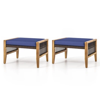 Make outdoor leisure time more comfortable with our 2-piece outdoor patio ottomans! Designed with your comfort in mind, these outdoor footrests with thickened cushions not only allow you to sink into relaxation as you prop your feet up on them but also transform these ottomans into additional seating for different needs. No matter how you use them, the selected materials (solid acacia wood, anti-rust metal tubes and colorfast mix brown PE rattan) make these patio footstools stable and long-lasting to use.