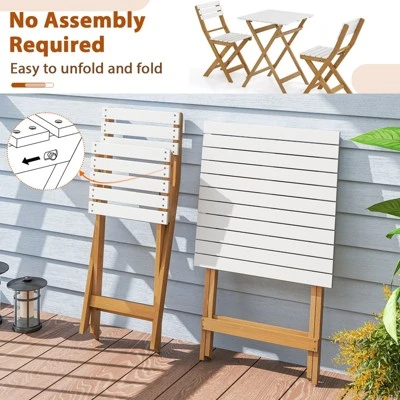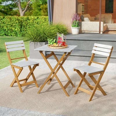 Made of acacia wood with a PU coating, this patio bistro table and chairs set combines stunning aesthetics with durability. The foldable bistro table features a large tabletop, providing ample space for your outdoor essentials. Each patio dining chair is designed with a curved backrest for enhanced comfort. The foldable, lightweight design makes it easy to move and store, perfect for your patio, backyard, or poolside. Designed for stability, the folding outdoor furniture set incorporates stable X-shaped structures and reinforced crossbars, creating an ideal spot for relaxing leisure times for you and the one you love.