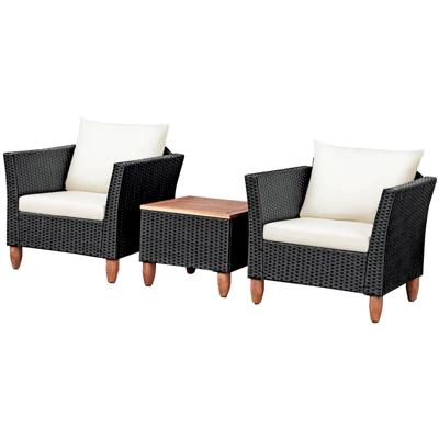 Our rattan patio conversation set which will provide you comfortable experience in your leisure time. This set of outdoor furniture is made of premium rattan and strong steel, which is long-lasting and has a long service life. And the feet are made of solid wood which add sturdiness of the set. They also can be adjusted to apply for uneven ground. The thick soft cushions are comfortable and breathable, which can relieve your fatigue of the whole day. Removable covers of cushion are easy to clean. Modern and stylish lines make this furniture set a perfect embellishment for backyard, patio, balcony or any other outdoor space! If you are looking for such a rattan bistro set, this will be your ideal choice!