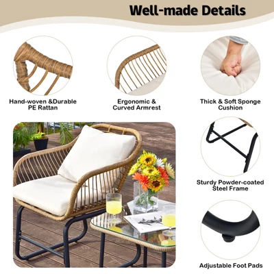 - 【Modern Design & Versatile Use】 Combining exquisite rattan style with simple design, this bistro set will add beauty to your indoor or outdoor living space, including the patio, balcony, poolside, garden, etc. Additionally, this bistro set comes with 2 chairs and 1 coffee table, which is perfect for you to enjoy leisure time with your loved one.