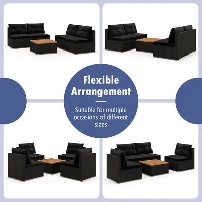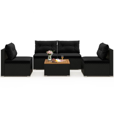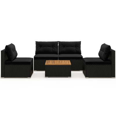 Discover unparalleled elegance and coziness for outdoor living with this 5-piece rattan sofa set.Designed with premium PE rattan, each piece showcases anti-fade weaving that not only enhances durability but offers an aesthetically pleasing look for any setting. Sink into the high-density filled cushions which are designed for utmost comfort. Furthermore, the square coffee table featuring robust acacia wood/tempered glass top is perfect for gatherings and outdoor refreshments. With the flexibility to arrange the seating as you desire, this patio set boasting premium material promises to adapt to various spaces from your backyard oasis to a cozy balcony retreat.
