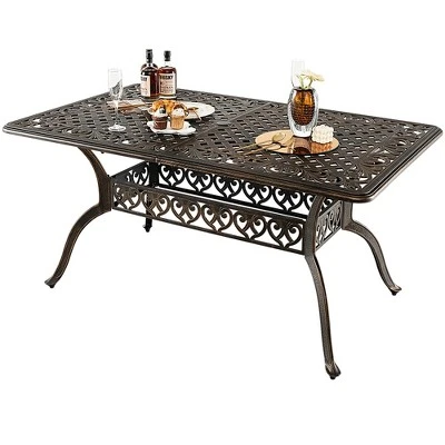 This patio cast aluminum table is ideal for you to have a meal in outdoor occasions.The 59″ x 35.4″ (L x W) large tabletop can accommodate multiple items, and allow 6-8 people to sit around. Therefore, you can spend a pleasant time with your friends or family. Made of high-grade cast aluminum, the table is super sturdy and rustproof for long service life. And the adjustable footpads make the table stand more stably. Furthermore, the umbrella hole is perfect for most kinds of patio umbrellas, so you can relax without scorching sunlight. With appealing appearance and suitable size, this premium cast aluminum table will be an ideal choice for different outdoor places.