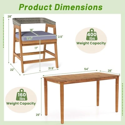 Transform your outdoor dining experience with this exquisite acacia wood dining set, blending unrivaled durability and stylish comfort. Each piece is meticulously crafted from premium acacia wood ensuring robustness and a splinter-free texture. The chairs feature appealing gray PE rattan backrest that promises long-lasting elegance. The dining set also comes with seat cushions for ultimate coziness. Centered around a 54-inch slatted table, this furniture set not only resists stain and water accumulation but also serves as a grand focal point for any gathering. As an indispensable addition to any backyard or deck, this dining set offers a perfect balance of functionality and fashionable appeal, making every outdoor meal a delightful experience.