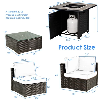 Tangkula 6 PCS Patio Wicker Furniture Set With 30″ Gas Fire Pit Table 50,000 BTU Black/Red/Turquoise/Navy/White Cushions