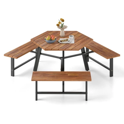 Enjoy your outdoor dining experience with the wooden picnic table!Boasting 3 benches, the wooden picnic table set is ideal for 3-6 people. Crafted from premium acacia wood with remarkable hardness and natural charm, the picnic table bench set for 6 is as long-lasting as it is beautiful. Treated with protective oil for effortless upkeep, the 1.2″ thick tabletop supports long-term use.(The umbrella and umbrella stand are required(not included).) Additionally, the wide H-shaped metal legs promise a stable structure. Furthermore, the umbrella hole with cover and pole stabilizer enables you to secure your parasol conveniently. Adjustable foot pads and non-slip pads are fitted to ensure added stability.