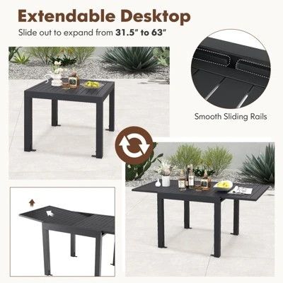 - Extendable Desktop: The patio aluminum table effortlessly expands from 31.5” to 63”/ 80 cm to 160 cm, complemented by the smooth sliding rails. Thus, this large metal table can comfortably seat 4-6 people, offering flexibility and convenience for any occasion.