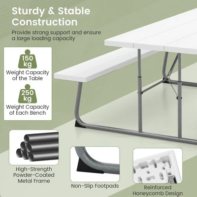 A Versatile and Convenient Outdoor Seating Solution for All Your Gatherings!Our folding picnic table set includes a rectangular table and 2 benches. The table measures 72″ x 29″ x 29″ (L x W x H), and the bench measures 72″ x 11.5″ x 18″ (L x W x H), which can comfortably accommodate up to 8 people. In contrast to other wooden tables or metal tables, our HDPE tabletop is fade-resistant, weather-resistant, crack-resistant, and ultraviolet-resistant, lasting for years to come. And the heavy-duty powder-coated metal frame ensures good sturdiness and stability. More than that, this table set can be easily folded and stored away, saving valuable space when not in use.