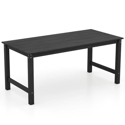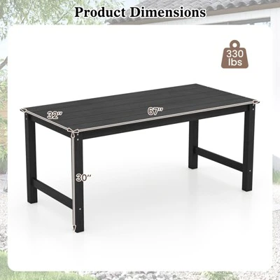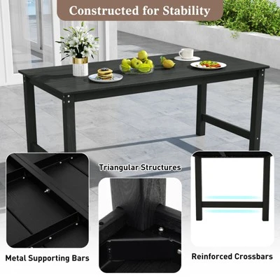 Dine in delight with our patio dining table!Made with premium HDPE material, this outdoor garden table is designed to withstand the elements, offering outstanding fade and weather resistance. It features a sleek, wood-grain tabletop for a hint of sophistication and is equipped with a built-in umbrella hole for a variety of umbrella styles, perfect for those sunny day gatherings. Generously sized at 67″ x 32″, the tabletop provides ample space for dining and socializing. The robust design includes metal support bars, triangular structures, and reinforced crossbars for a stable and secure dining experience.