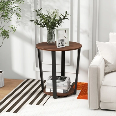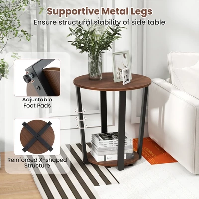 Enhance your living space with our 2-tier round end table, offering ample storage and display space for cups, vases, and magazines. Crafted with a sturdy metal frame and X-shaped support legs, this side table promises durability and stability. The charming industrial style combines wood-like textures with a sleek metal finish, making it a perfect fit for various interior design themes. More, the details of the side table showcase the better workmanship, such as the smooth round edges that protect your family, and the easy-to-clean surface is smooth and burr-free. Its compact size allows for easy placement in tight corners or small spaces, serving as a versatile end table or nightstand.