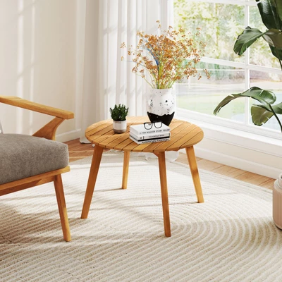 Elevate your living space with this outdoor side table.Crafted with high-quality acacia wood, this round side table combines durability with natural aesthetic. For storage convenience, the spacious slatted tabletop facilitates the placement of snacks, drinks, books and decorations. For higher stability, the wooden table is supported by cross-shaped structure. Whether you are hosting a cozy gathering, enjoying a quiet afternoon tea, or simply want a stylish surface for your outdoor or indoor area, this acacia wood side table caters to your needs.