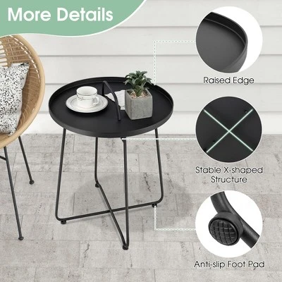 Are you looking for an outdoor side table for your patio? This table is a good choice for you.This patio side table is made of high-quality metal and is powder-coated to provide excellent rust resistance. The X-shaped frame and anti-slip foot pads enhance the stability of the table. And the metal frame provides a large load-bearing capacity of up to 110 lbs. It can be used not only as an outdoor side table on the terrace,but also as a regular round coffee table in the living room or bedroom. It has a unique table top with handles,so you can easily move it to anywhere. Suitable for any indoor or outdoor space such as terrace,garden,living room,study,etc.!