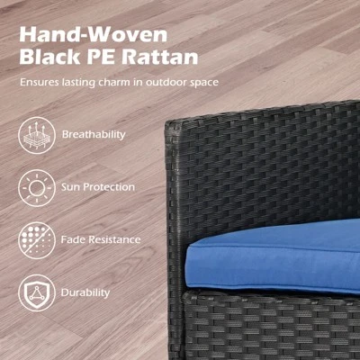 Tangkula Outdoor Rattan Loveseat 2-Seat Patio Conversation Set With Built-in Coffee Table Cushions Wicker Bench Furniture Blue