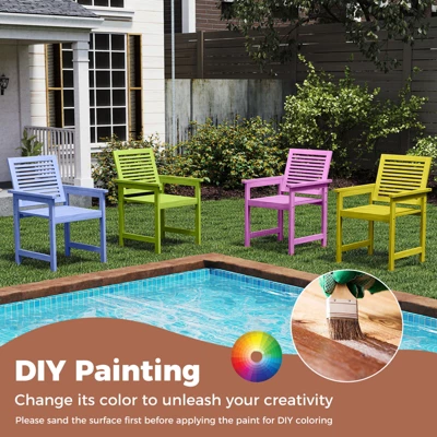 Add a perfect addition to your outdoor living space with our 4-piece patio dining chairs.Each lawn chair, robustly designed with reinforced crossbars, supports up to 330 lbs, ensuring stability and long-term use. Crafted from solid wood with a splinter-free finish, these patio wooden armchairs boast natural beauty and smooth texture, ready for your creative touch with DIY painting to align your outdoor decoration. Additionally, the ergonomic design features a 105° inclined backrest, slatted seats and cozy armrests, promising both relaxation and elegance in your outdoor gatherings.