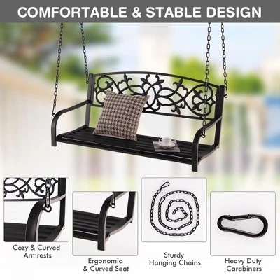 Create a beautiful sitting area to enjoy the beautiful weather with your beloved ones by relaxing on this porch swing bench! Made of high quality metal frame with powder-coated surface, this hanging swing porch is rustproof and durable enough to stand the test of time. Plus, 2 sturdy hanging chains are evenly stressed and hold the entire bench firmly. With ergonomic backrest and armrests, the hanging swing allows you to sit comfortably while relaxing on it. The unique patterns and stylish appearance make the swing bench suitable for backyard, porch, deck, garden and so on.