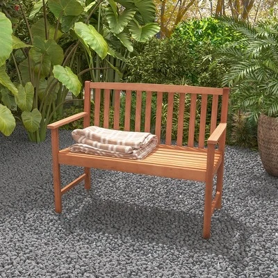 Indulge in heartfelt conversations and relax together with your partner on this 2-seat wood bench. The wide armrests and breathable seat offer optimum comfort, ensuring that you can unwind in pure bliss. Meticulously constructed from premium eucalyptus wood, this bench is a testament to its long-lasting durability and unwavering sturdiness, providing you with a stable and secure seating arrangement. To add to its allure, the patio bench showcases a stunning natural aesthetic with natural appearance, making it a striking choice for those seeking sophistication and relaxation in outdoor environments. Embrace the allure of the outdoors and immerse yourself in relaxation with this extraordinary patio bench.