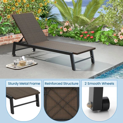 Experience the outdoors in comfort and style with our outdoor PE rattan chaise lounge chair.This sun lounger, with a robust metal frame supporting up to 400 lbs, features premium PE rattan that resists sunlight and fading for lasting vibrancy. Furthermore, this tanning chair allows you to adjust easily between 4 reclining positions for personalized comfort. It can be moved effortlessly with built-in wheels.