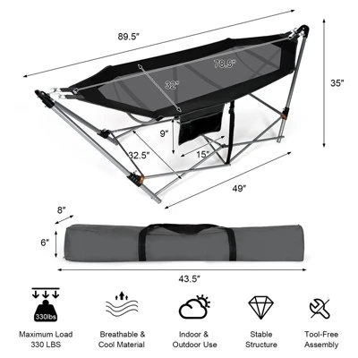 - 【Compact & Portable Design】 This portable collapsible hammock measures 43.5” x 8” x 6” (W x D x H) when folded, easy to store. Besides, comes with a carrying bag, the free-standing hammock can be taken out and stored effortlessly.