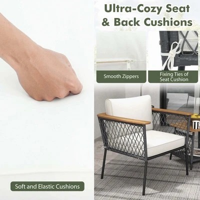 Experience outdoor living at its peak with this 3-piece patio furniture set, seamlessly blending luxury and functionality. The set includes premium gray PE rattan chairs and a coffee table expertly crafted for high-quality, complemented by solid acacia wood armrests and an elegant tabletop. The 2-tier coffee table not only offers ample space for necessities but also adds to its practical appeal with an additional rattan shelf. Enjoy ultimate comfort with ultra-cozy, elastic cushions featuring smooth zippers and fixing ties to prevent slipping. Transform your outdoor spaces into a haven of relaxation and style, perfect for enjoying peaceful mornings or entertaining guests beneath the starlit sky.