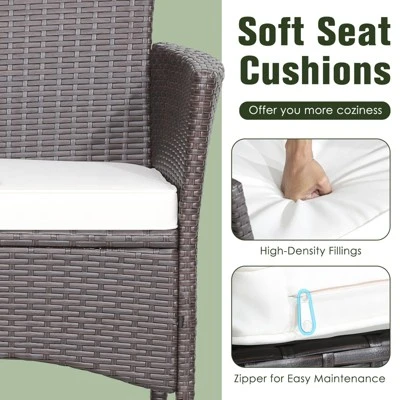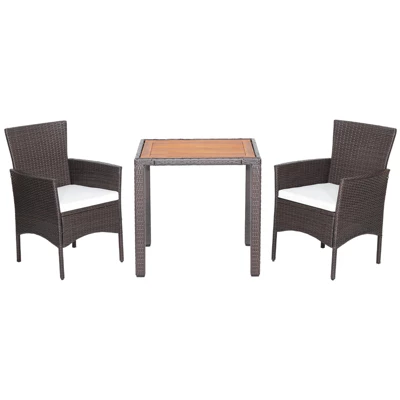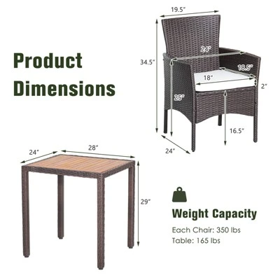 Enhance your dining experience with this exquisite 3-piece patio dining set! The set comprises two chairs made from long-lasting rattan, complete with cozy cushions, and a spacious dining table. Whether you wish to unwind with friends or family, this patio set is the perfect choice. The ergonomic seats and elastic cushions ensure maximum comfort, and the removable and washable cushion covers add convenience. Additionally, the dining table features a 28″ x 24″ (L x W) acacia wood tabletop, providing ample space for tableware, beverage, magazines, and more. When you are done dining, you can easily tuck the chairs under the table to save space.