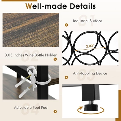 Are you still worried about not having space to put your tableware and wine together? Well,our wine rack table will be a great choice for you!Featuring a 3-tier wine rack,3-layer open shelves and 4-row glass holder,this indoor furniture combines wine rack and storage table as one,convenient to put the needed items at once. More storage space,more organized room. Meanwhile,the wine rack allows the wine bottle to be stored in angle for better flavor. You may show curiosity about what makes our wine table better than others. It is the thickened metal frame for stronger bearing capacity up to 330 lbs,which is superior to the ultra-thin metal frame for instability. And the anti-toppling devices make this coffee bar table safer for daily use.